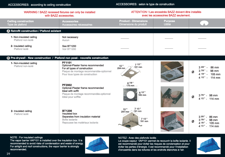 BAZZ accessories insure you can install BAZZ recessed fixtures anywhere in any type of ceiling or construction context : retrofit installation, insulated ceiling, non-insulated ceiling, suspended ceiling, new construction, renovation etc.