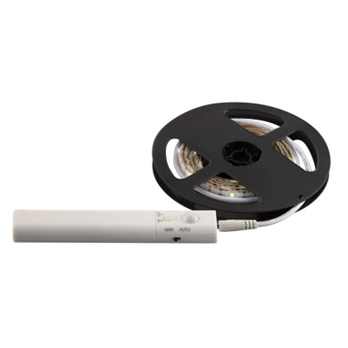 Ruban lumineux autocollant à DEL intégrées pour sous-comptoir. Fonctionne à batteries (4X AAA non incluses). Détecteur de mouvement infrarouge. IP65.